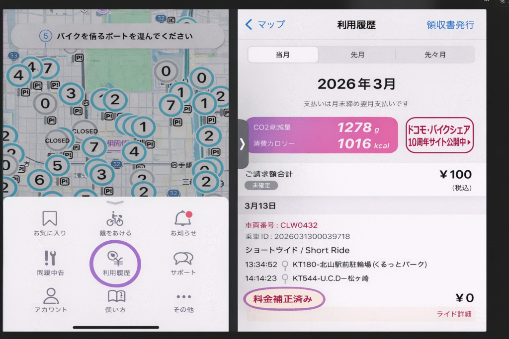 利用月の翌月5日以降にアプリの「利用履歴」より料金の補正をご確認ください。