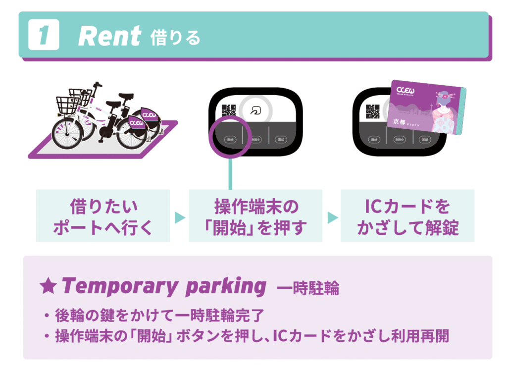 京都市内500箇所あるポートの中からお近くのポートで自転車を借りていただけます。途中で他のCLEW自転車へ乗り換えていただくこともできます。休日のお出かけに、観光に、ぜひご利用ください。