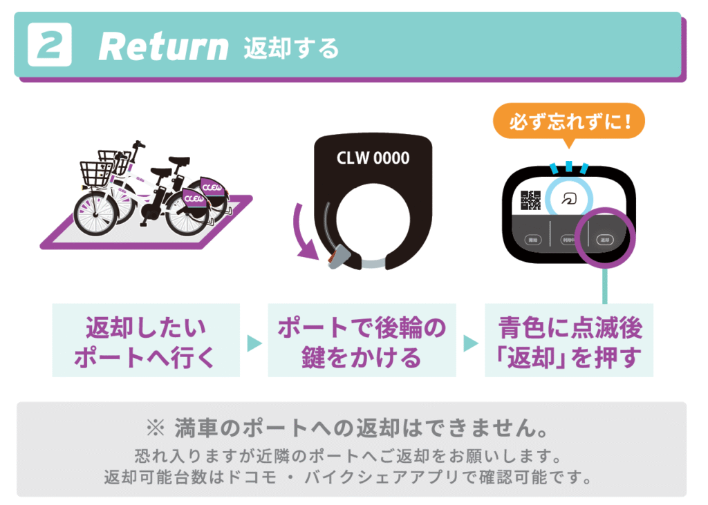 自転車を返却するには、施錠し、青いランプが点滅していることを確認してから返却ボタンを押してください。利用開始から24時間以内に、駆らずポートへ返却するようにしてください。