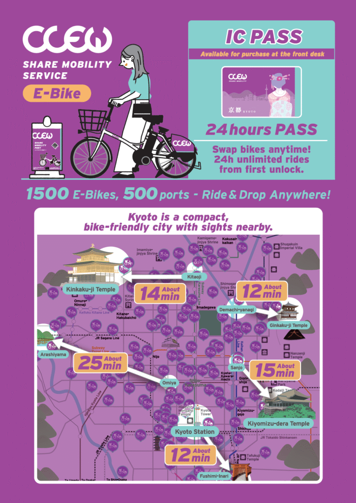 CLEW专用IC卡是一张可在京都市内500个租借点使用的专属卡,可轻松使用「CLEW」共享电动自行车服务,共有约1500辆电动自行车可供使用。